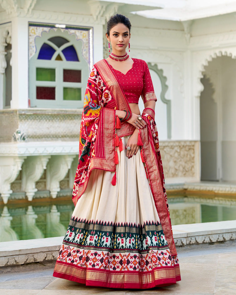 Off-White Color Tussar Silk Patola Printed Lehenga Choli